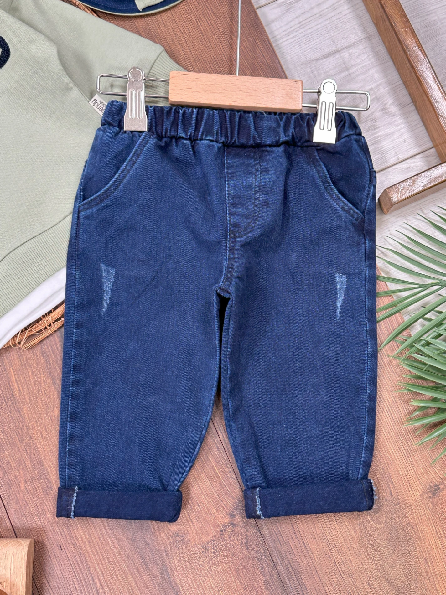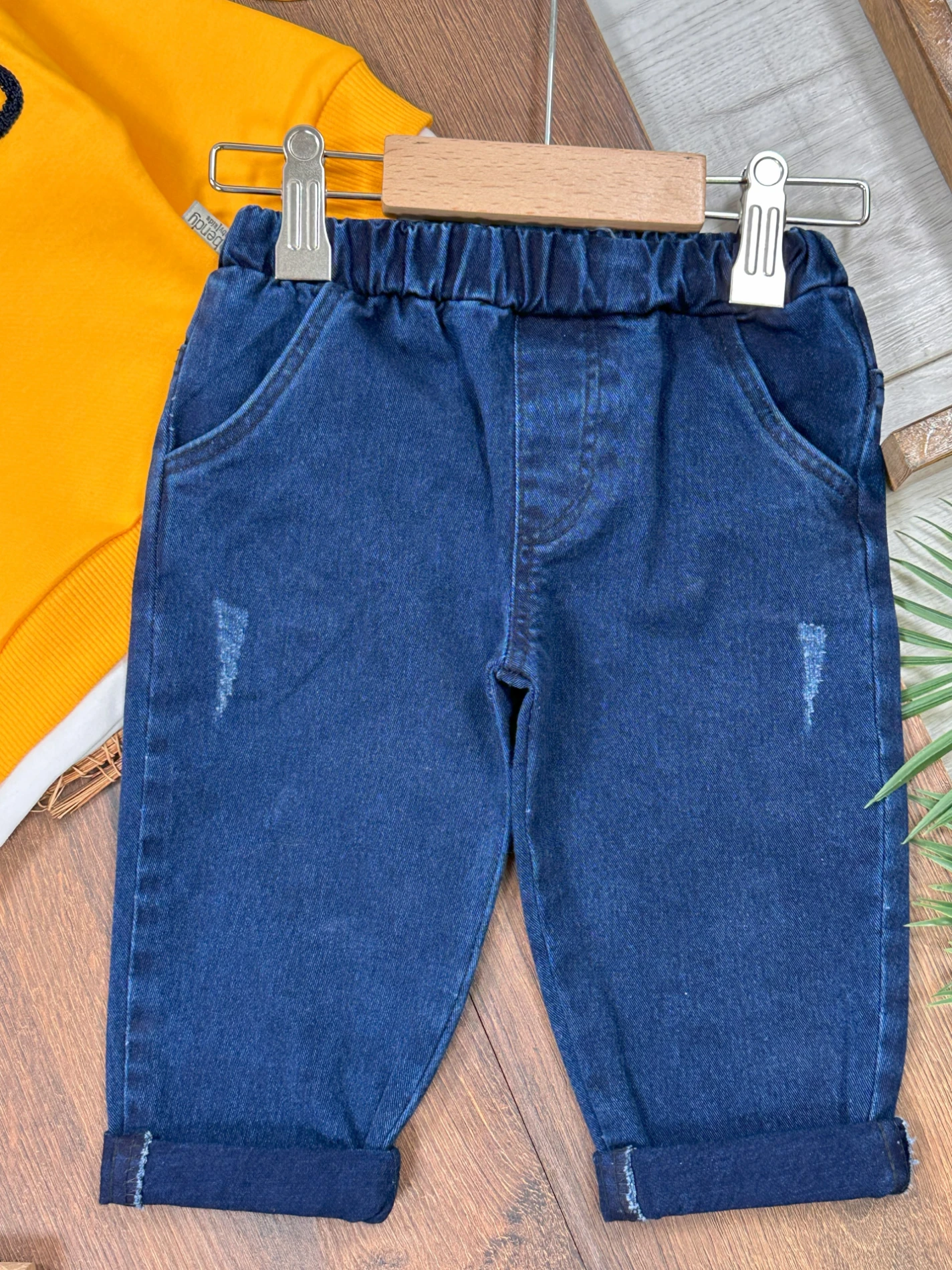 Çift Taraflı Şapka Likralı Kot Pantolon NakışlıSweatshirt 3lü Erkek Bebek/Çocuk Takım