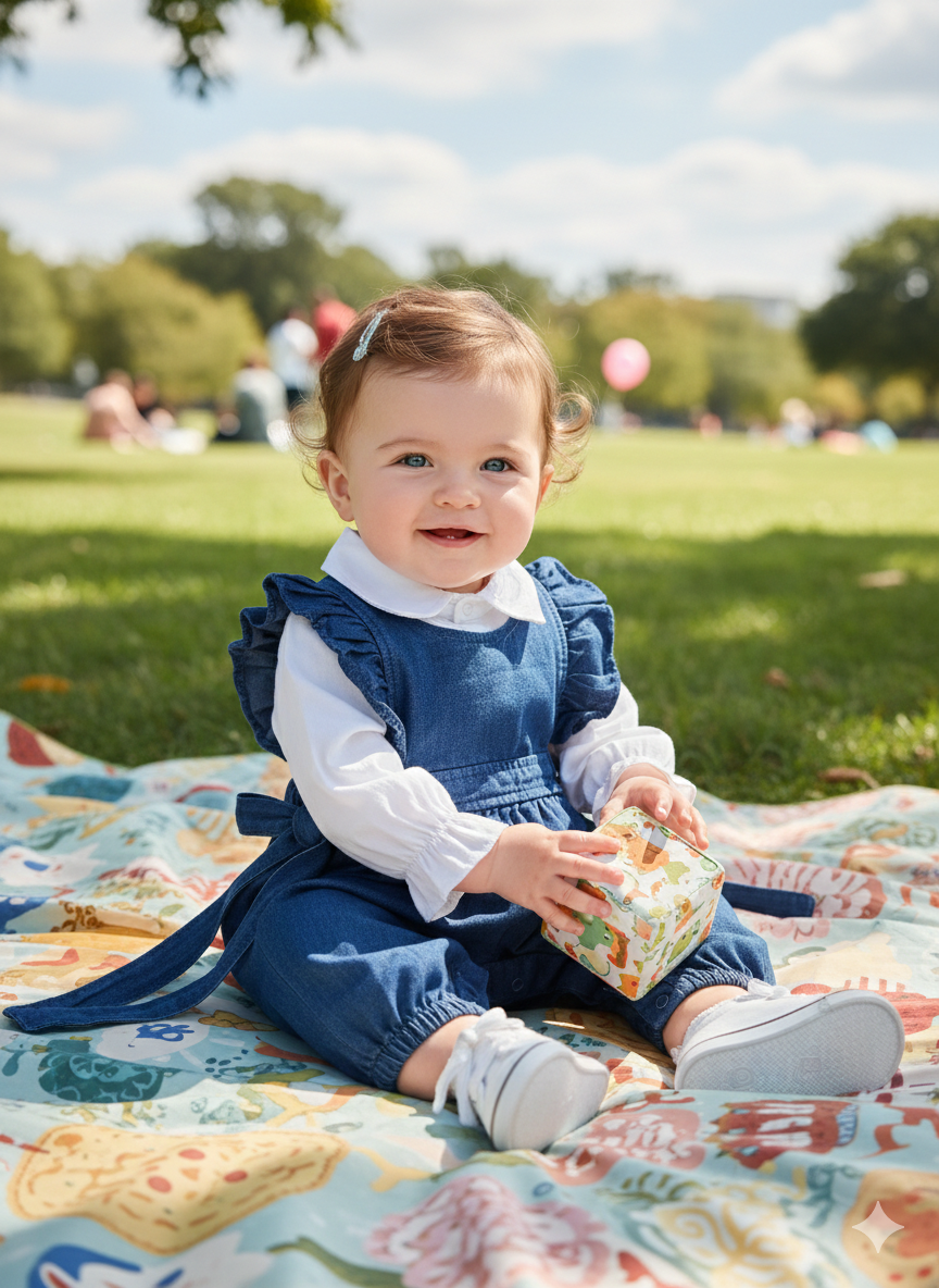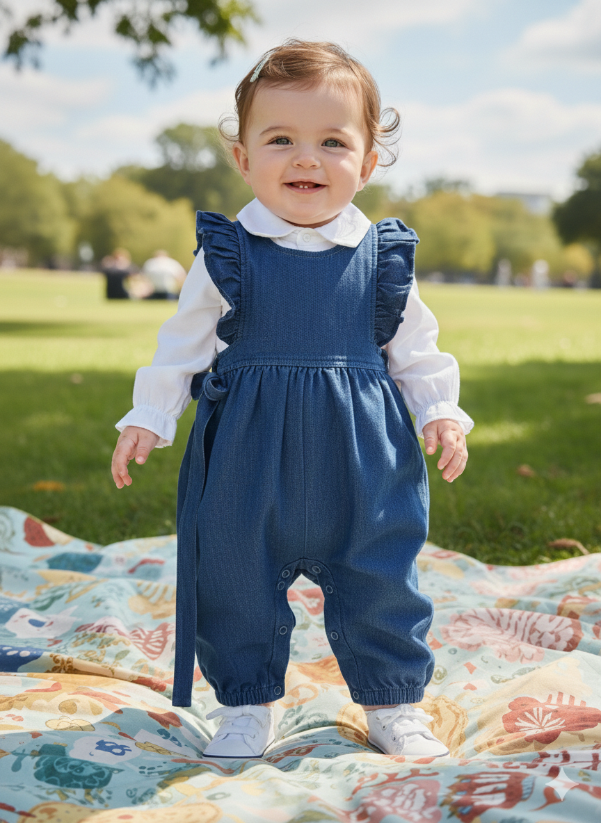 Şık ve rahat Müslin gömlek ile ayrı olarak sunulan düğme detaylı kız bebek kot tulum, konfor ve tarzı bir araya getiriyor. Yumuşak kumaşı bebeğinizin hassas cildine dost, hareket özgürlüğü sağlıyor. Günlük kullanıma ve özel anlara ideal, dayanıklı tasarım.