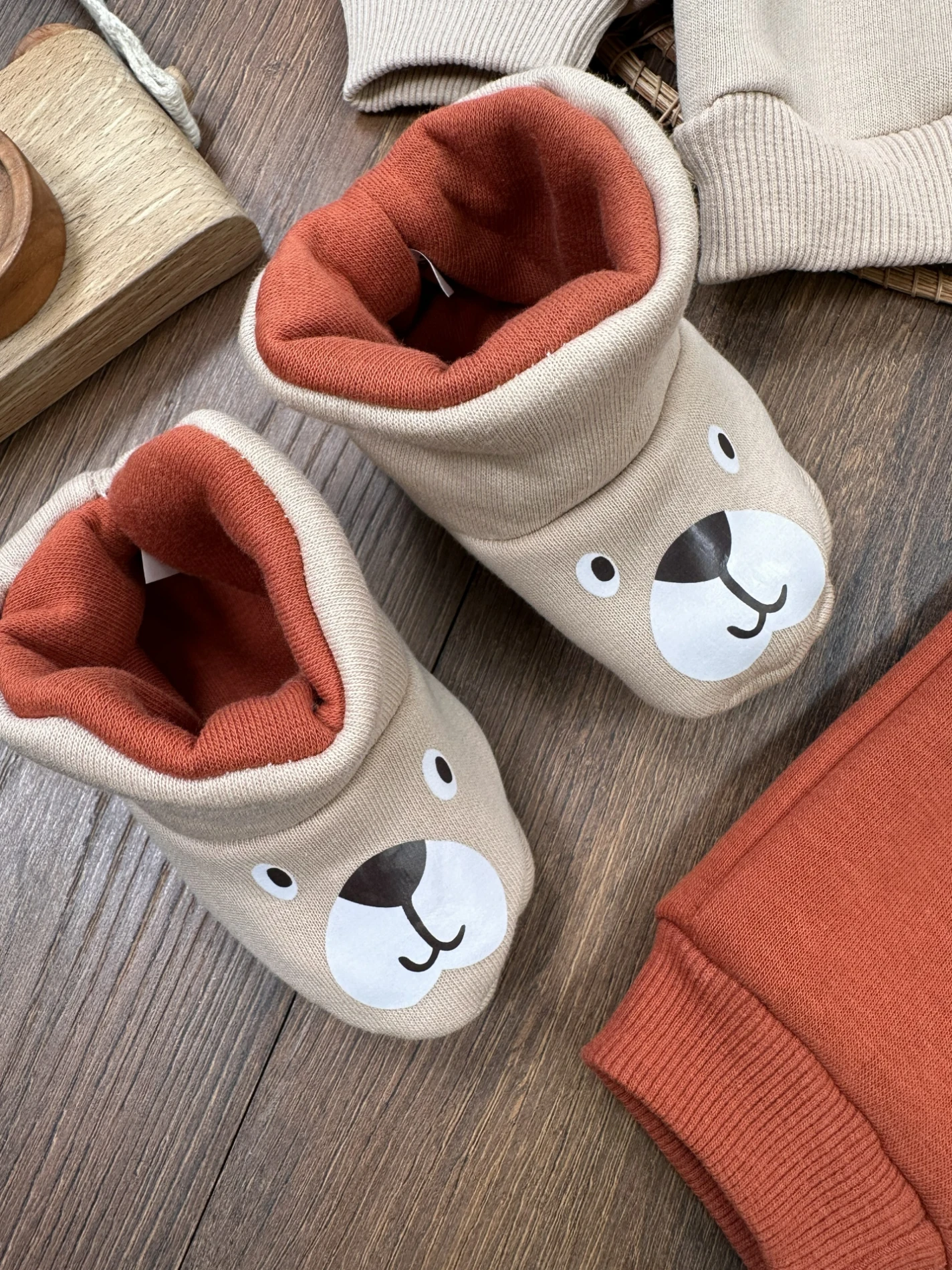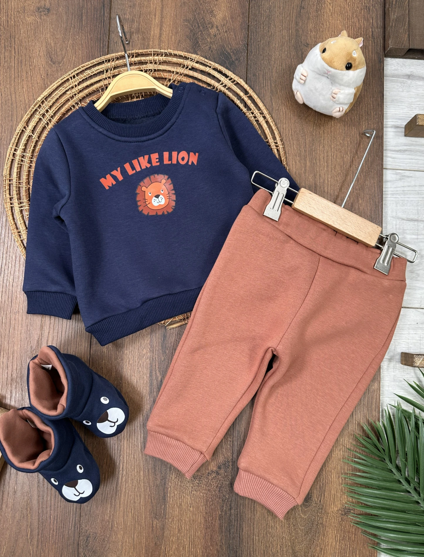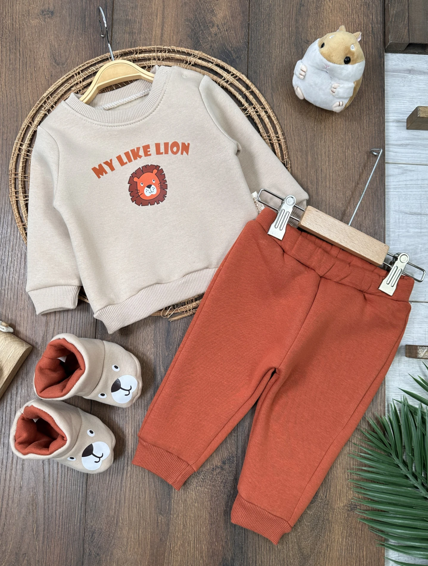 Panduf Patikli Aslan Baskılı 3 iplik Şardonlu Omuzdan Çıtçıtlı Kışlık Erkek Bebek Takım