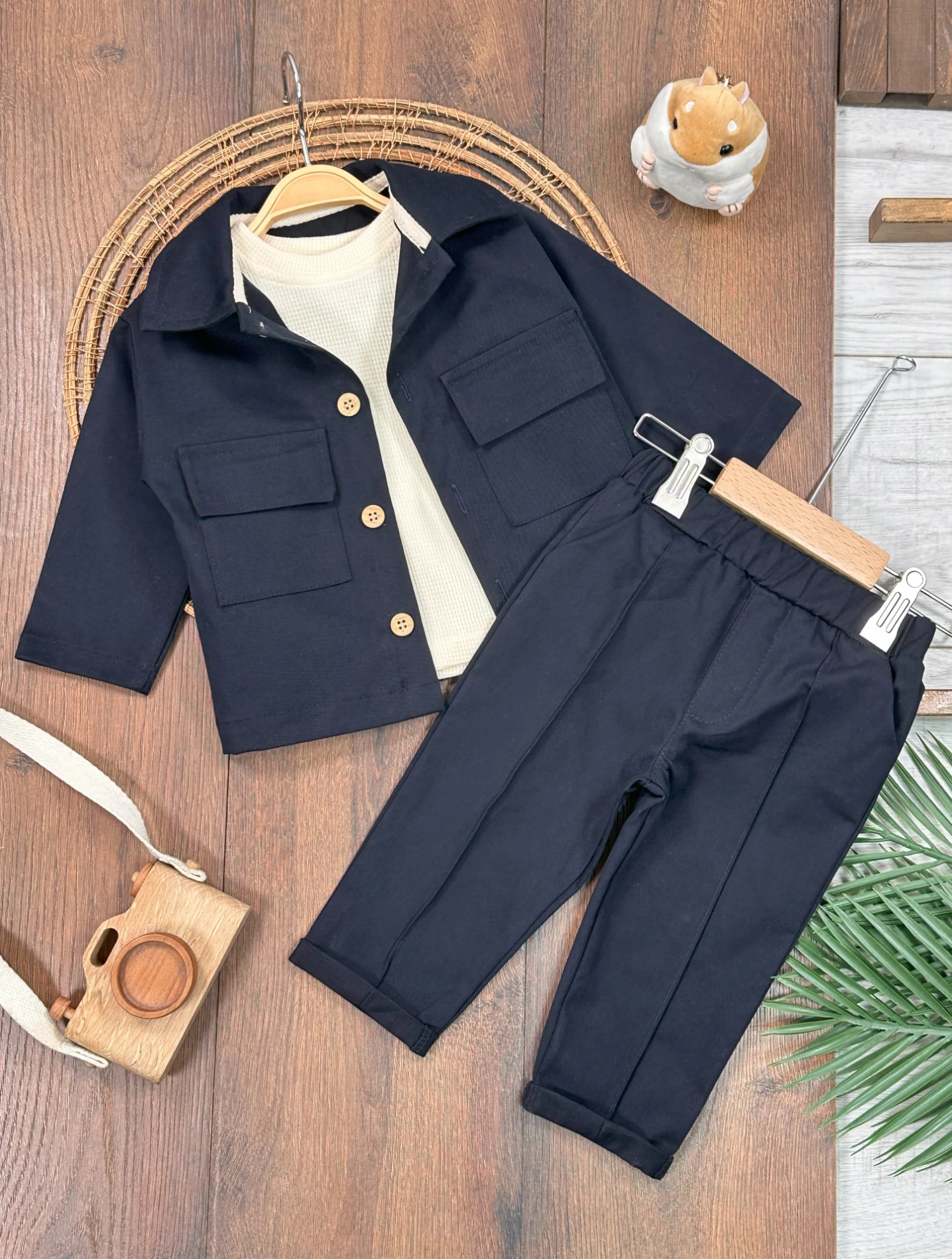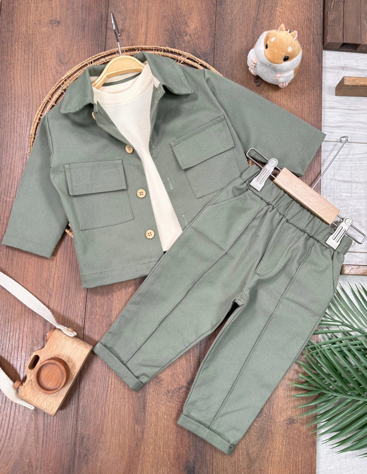 Safari Model Omuzdan Çıtçıtlı Sweatshirt 3lü Keten Likralı Erkek Bebek ve Çocuk Takım