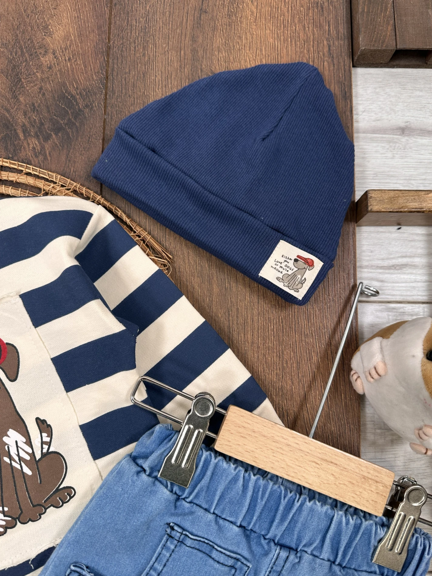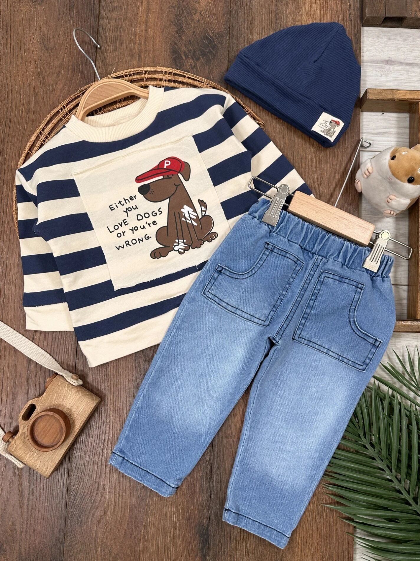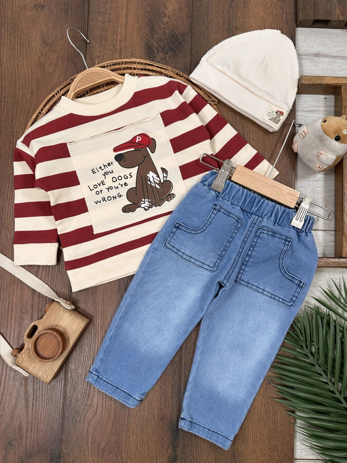 Şeritli Bereli Likralı Sevimli Köpek Baskılı Kot Erkek Bebek Takım