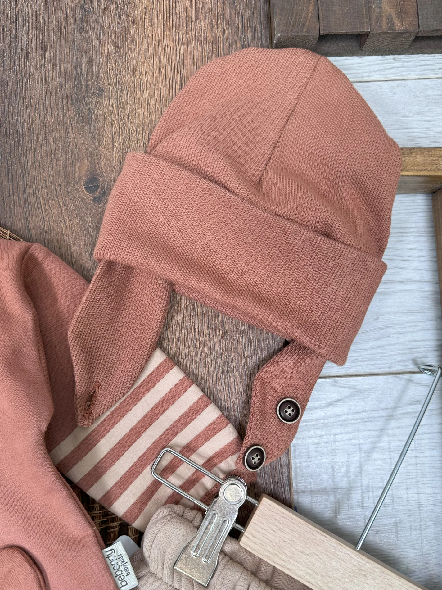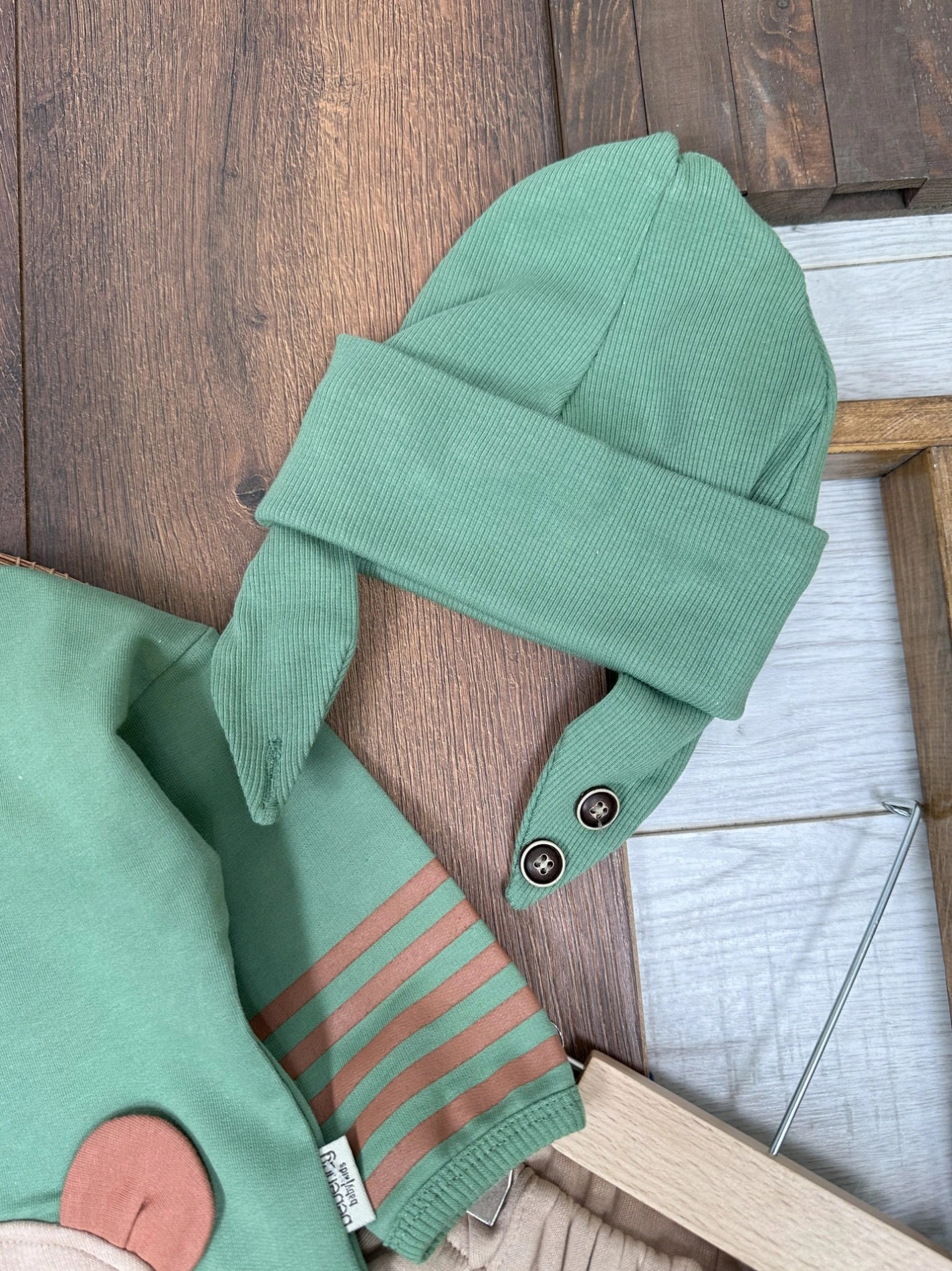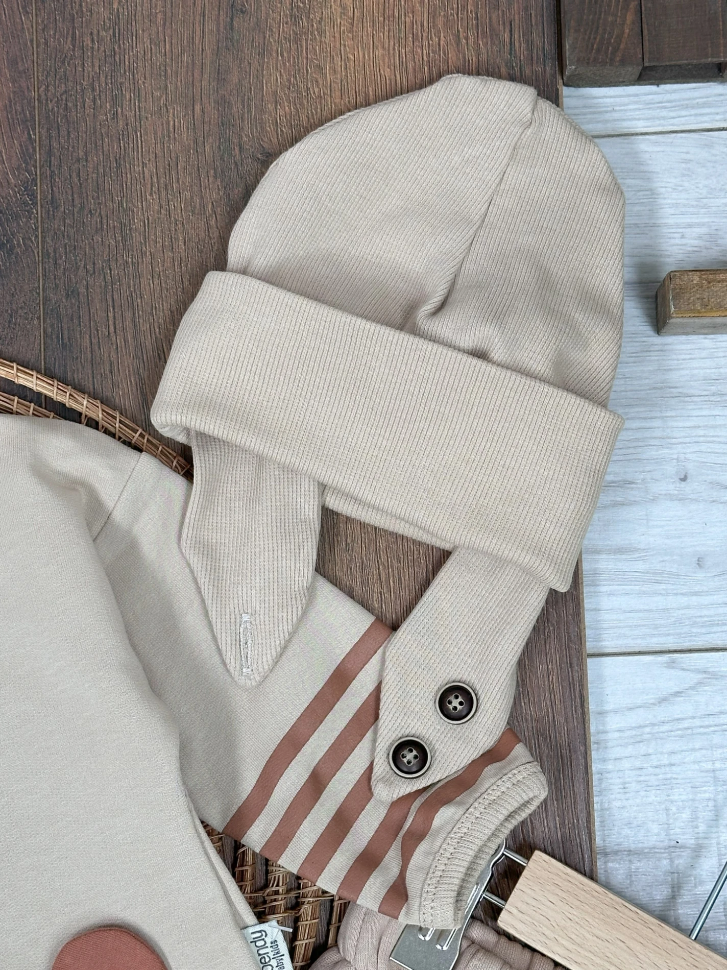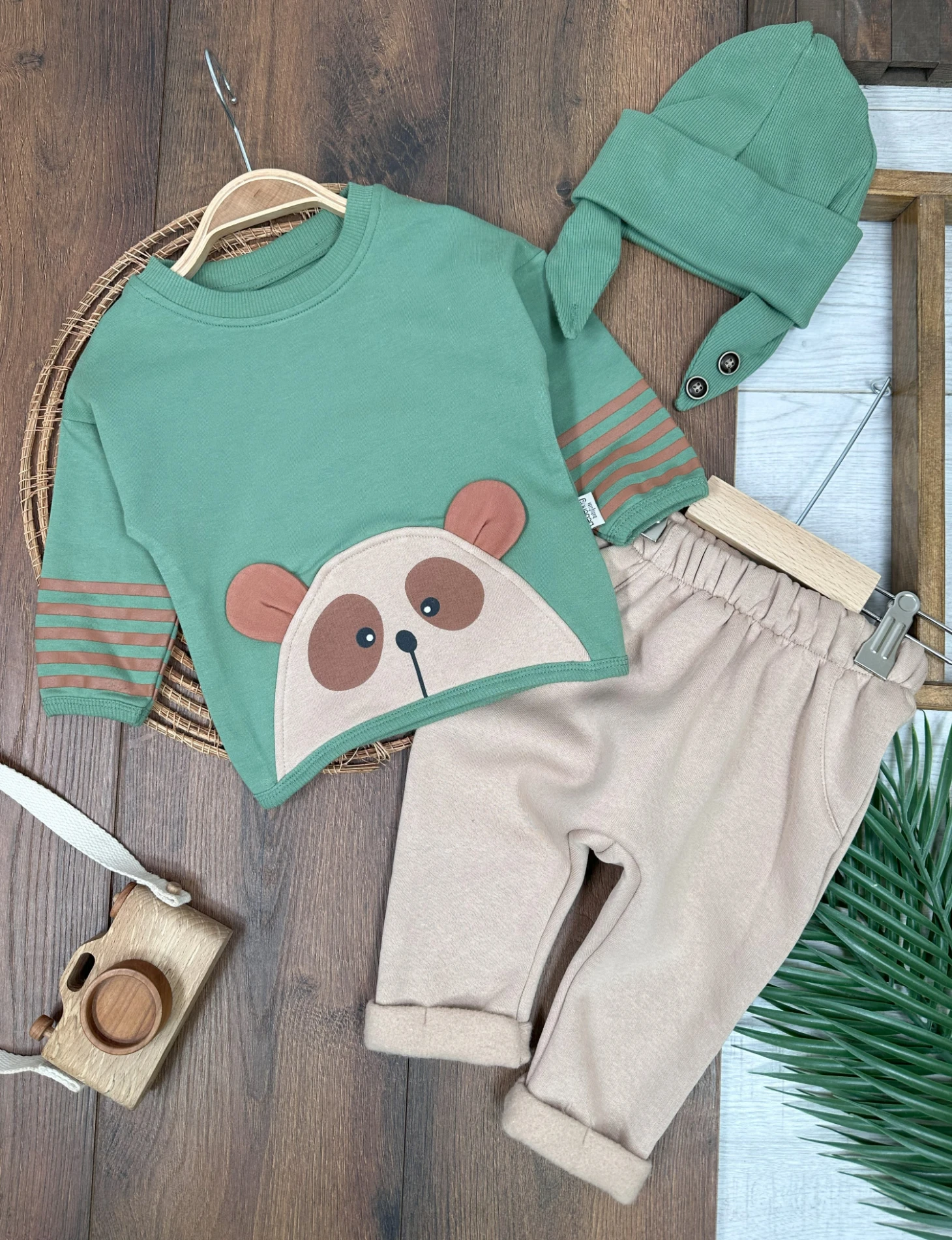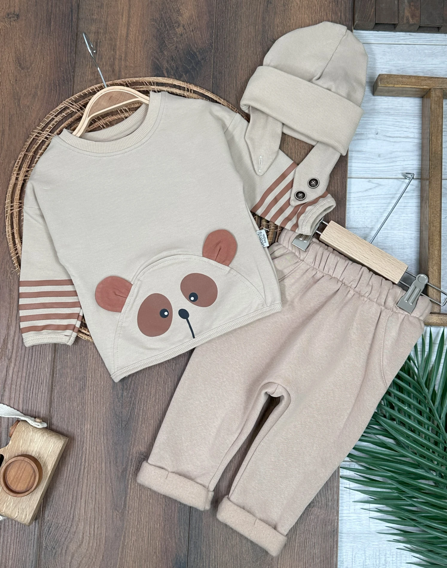 Şeritli Kol Detaylı Ayıcık Baskılı Kulaklı Bere Oversize 3lü Erkek Bebek Takım