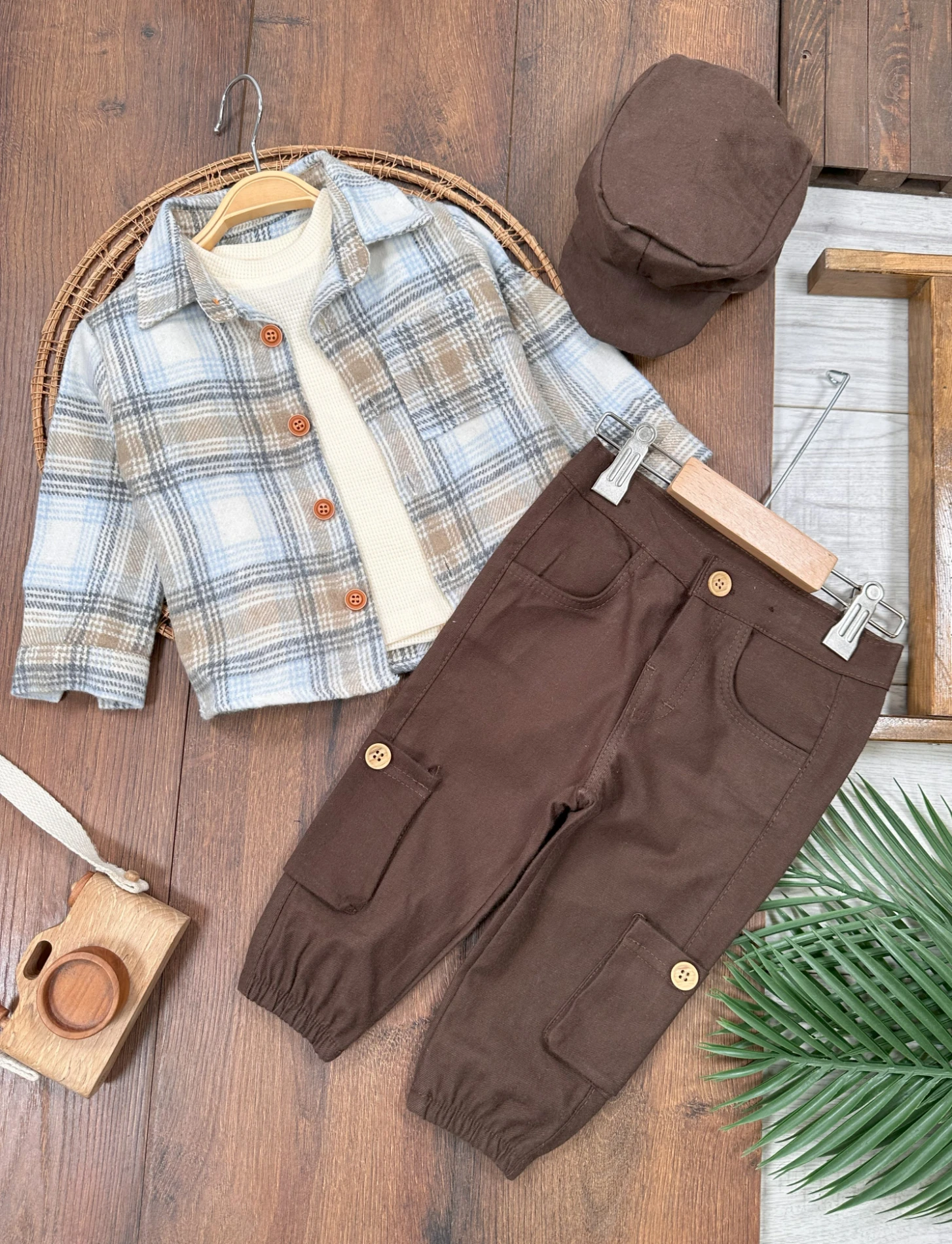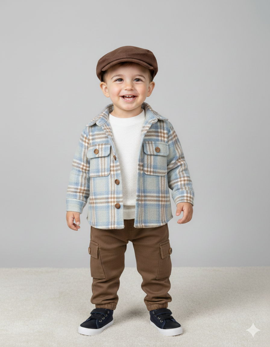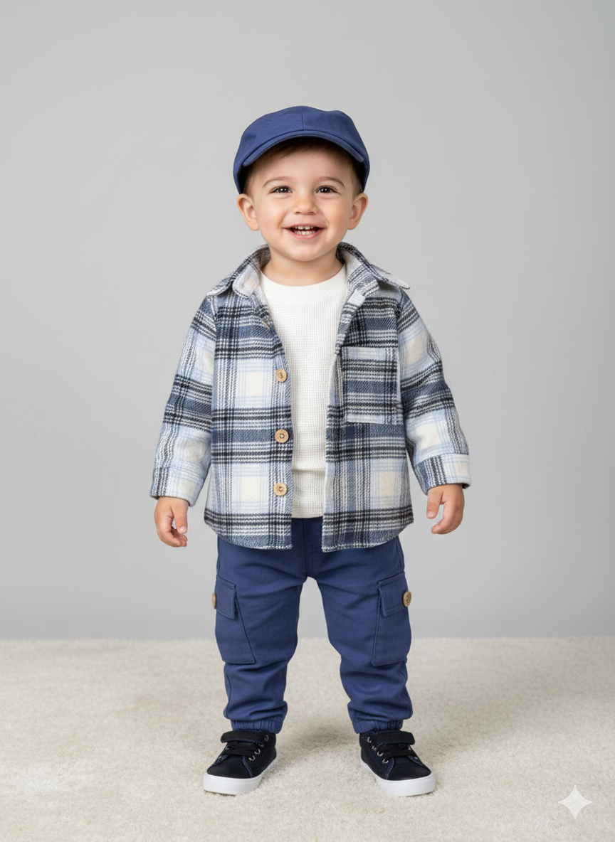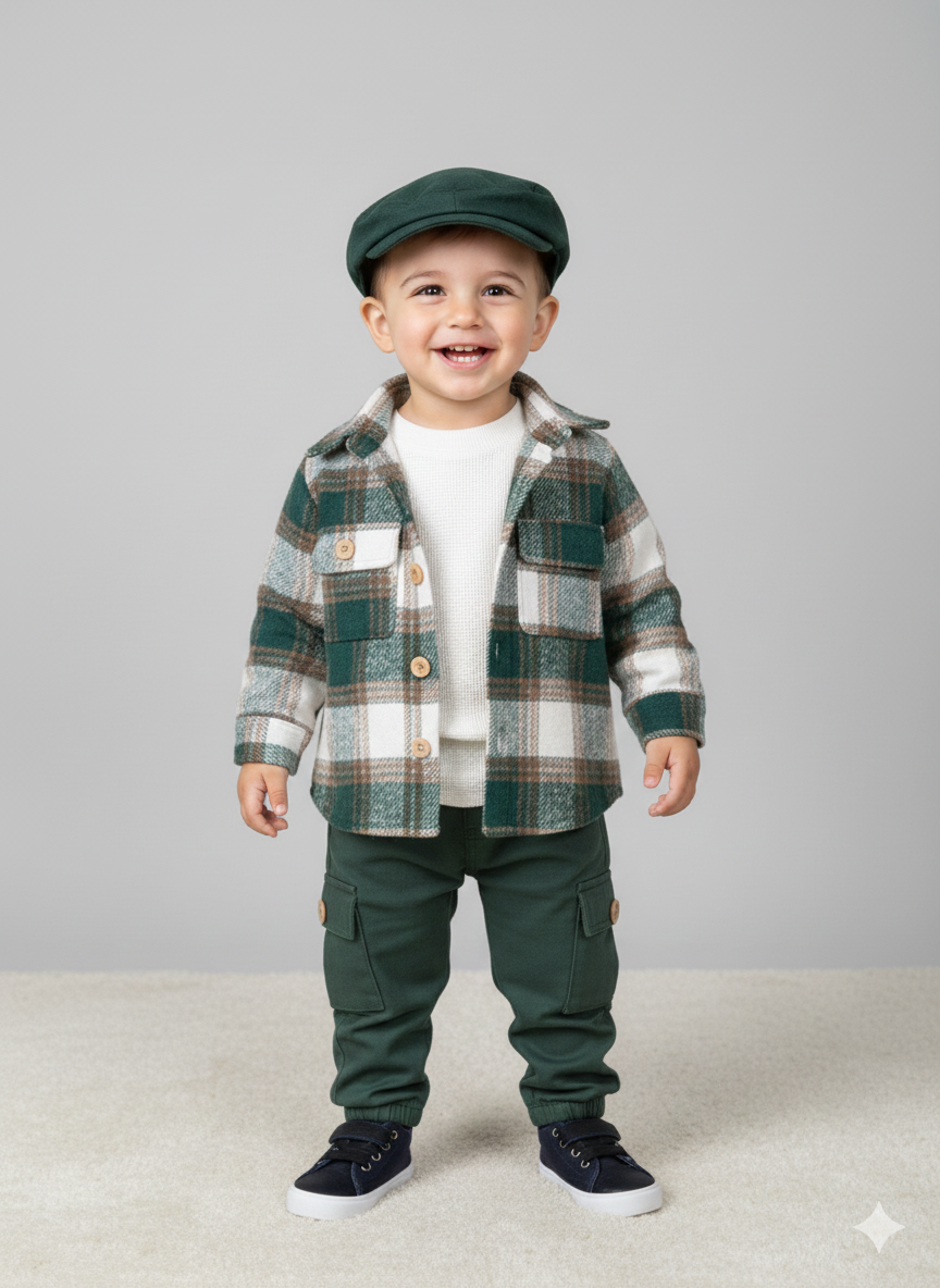Waffle Badili Kanvars Kargo Pantolonlu Oduncu Gömlek Şapkalı 4lü Erkek Bebek/Çocuk Takım
