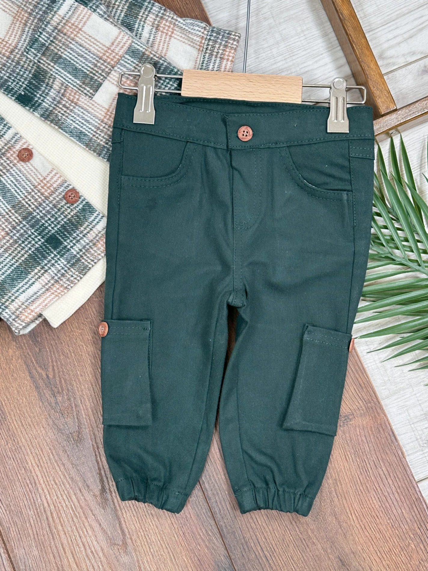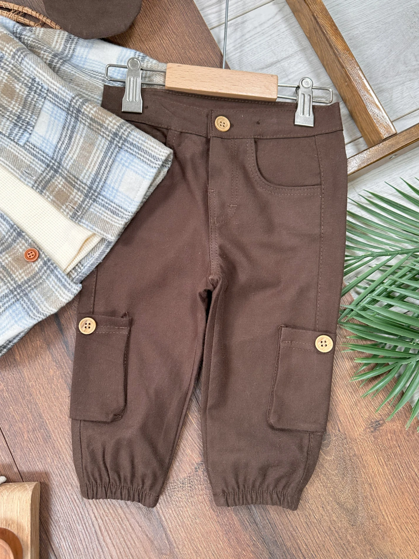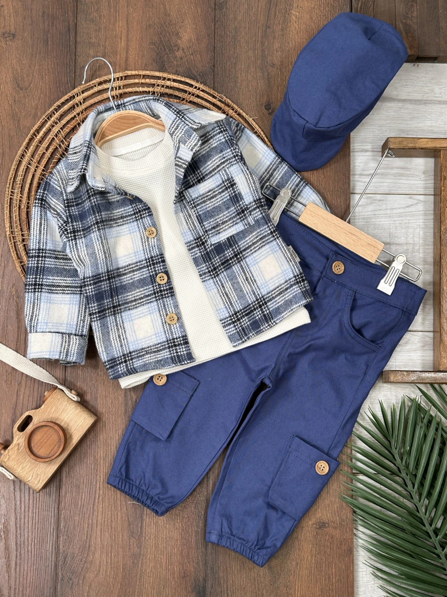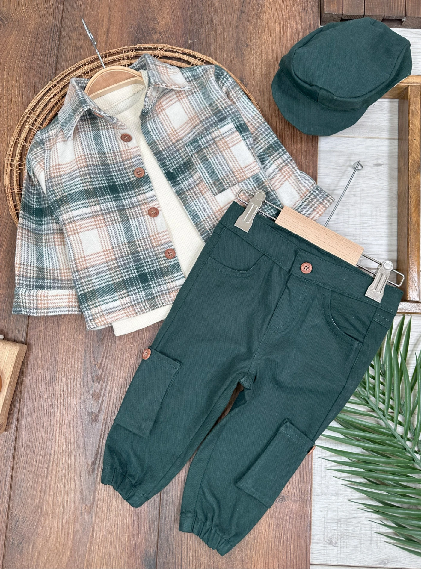 Waffle Badili Kanvars Kargo Pantolonlu Oduncu Gömlek Şapkalı 4lü Erkek Bebek/Çocuk Takım